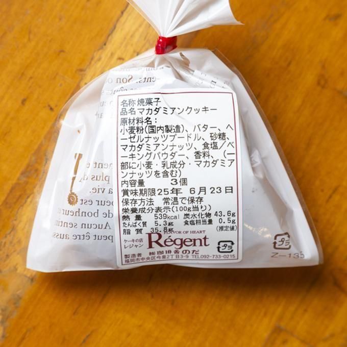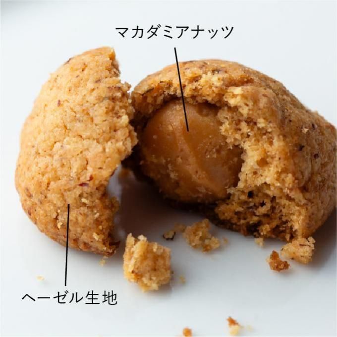 | 原材料 | 小麦粉(国内製造)、バター、へーゼルナッツプードル、砂糖、マカダミアンナッツ、食塩/ベーキングパウダー、香料、一部に小麦・乳成分・マカダミアンナッツを含む) |